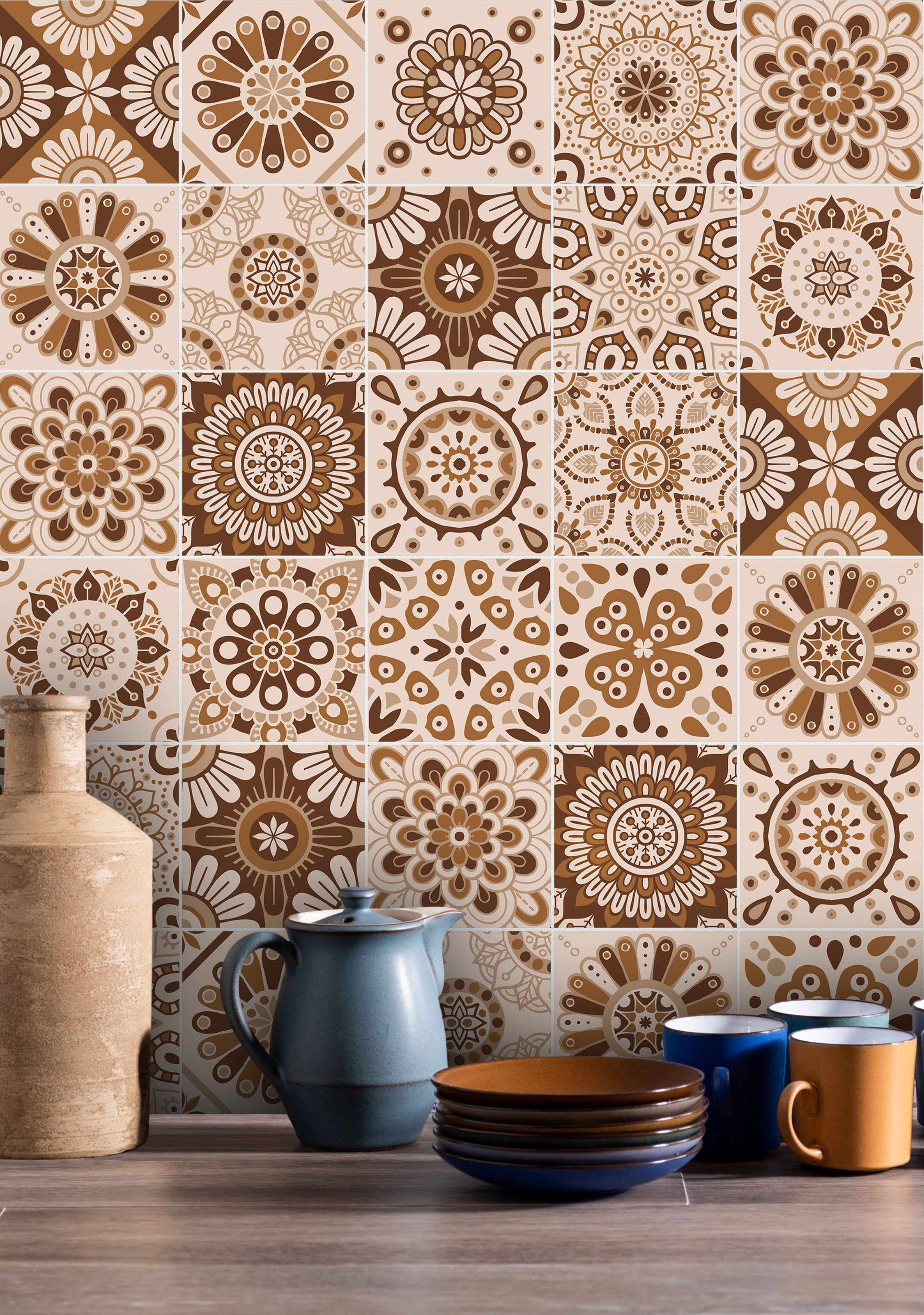 Burnt Cinnamon and Ivory Tile Stickers | Peel and Stick Kitchen, Bathroom, Wall Tile Decals | Antiskid Floor Tile Stickers