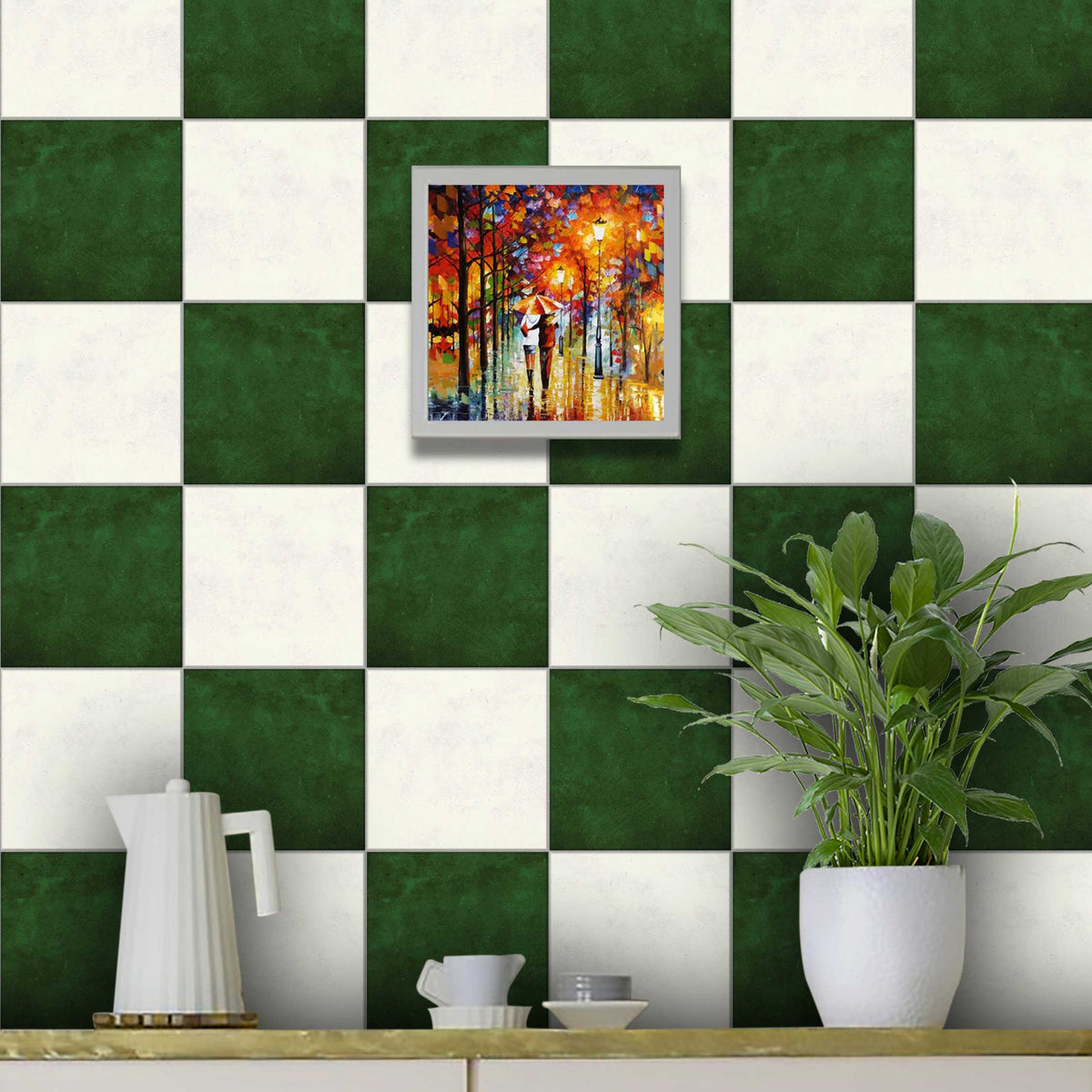 Mose Green and Ivory Checkered Texture Floor Tile Stickers | Peel and Stick Kitchen Bathroom Wall Backsplash Tile Vinyl | Removable