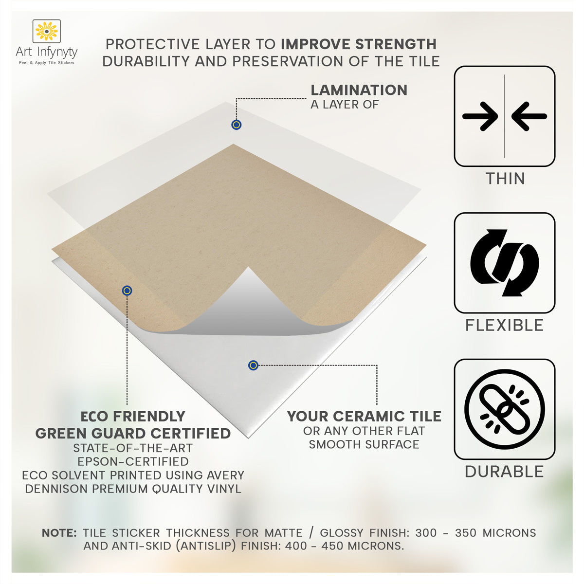 REMOVABLE DECALS - are best to cover smooth surfaces like walls, wall tiles, furniture, glass – whatever you want! Printed on a self-adhesive, removable, Peel & Stick material that can be easily stuck and removed. You can use them multiple times without damaging the surface and the sticker itself! The material handles humidity well; however, it cannot be exposed to a direct source of water. This material has a matte and gloss finish. Please note that this material won’t adhere to textured and is covered with latex/washable paint surfaces.