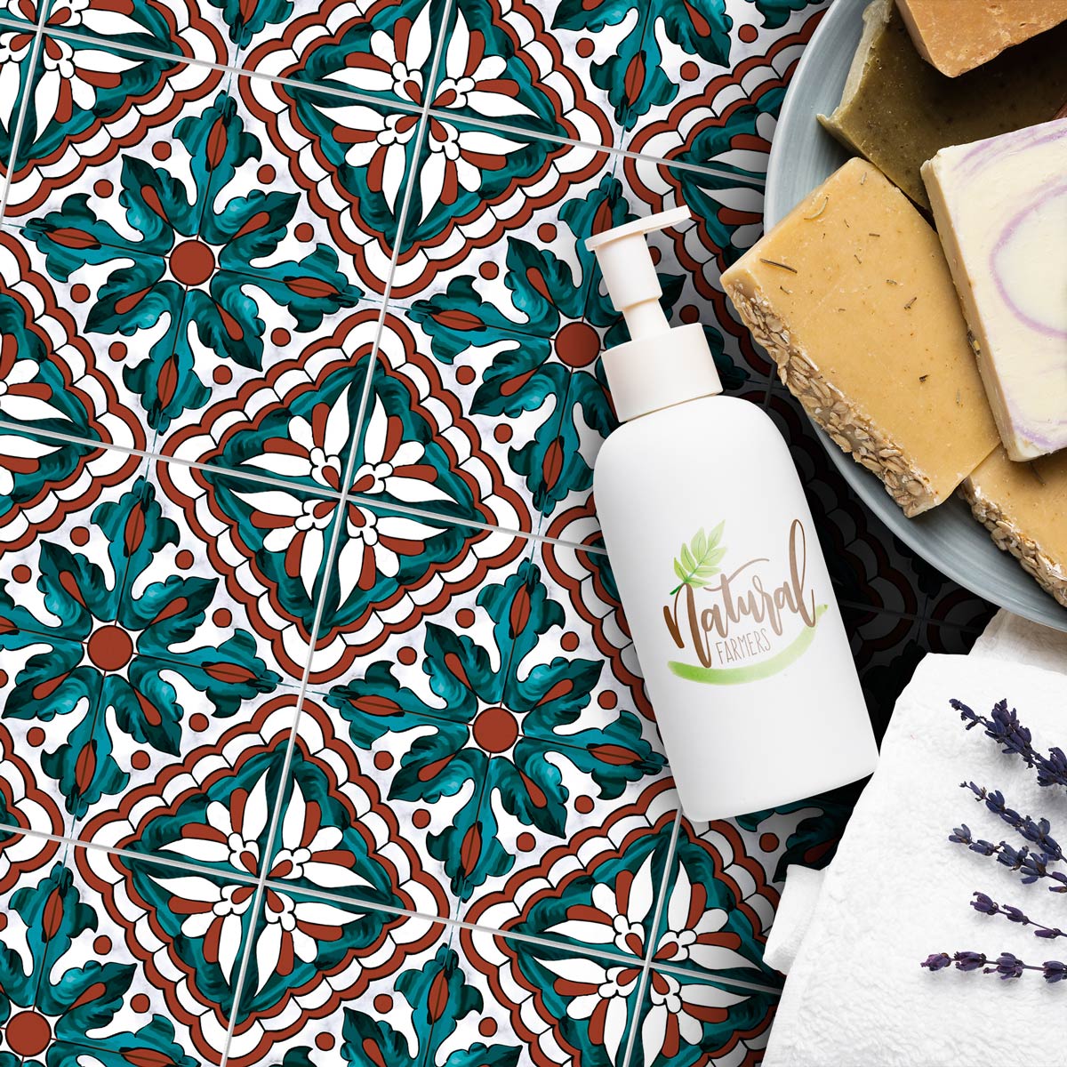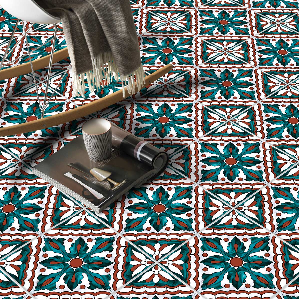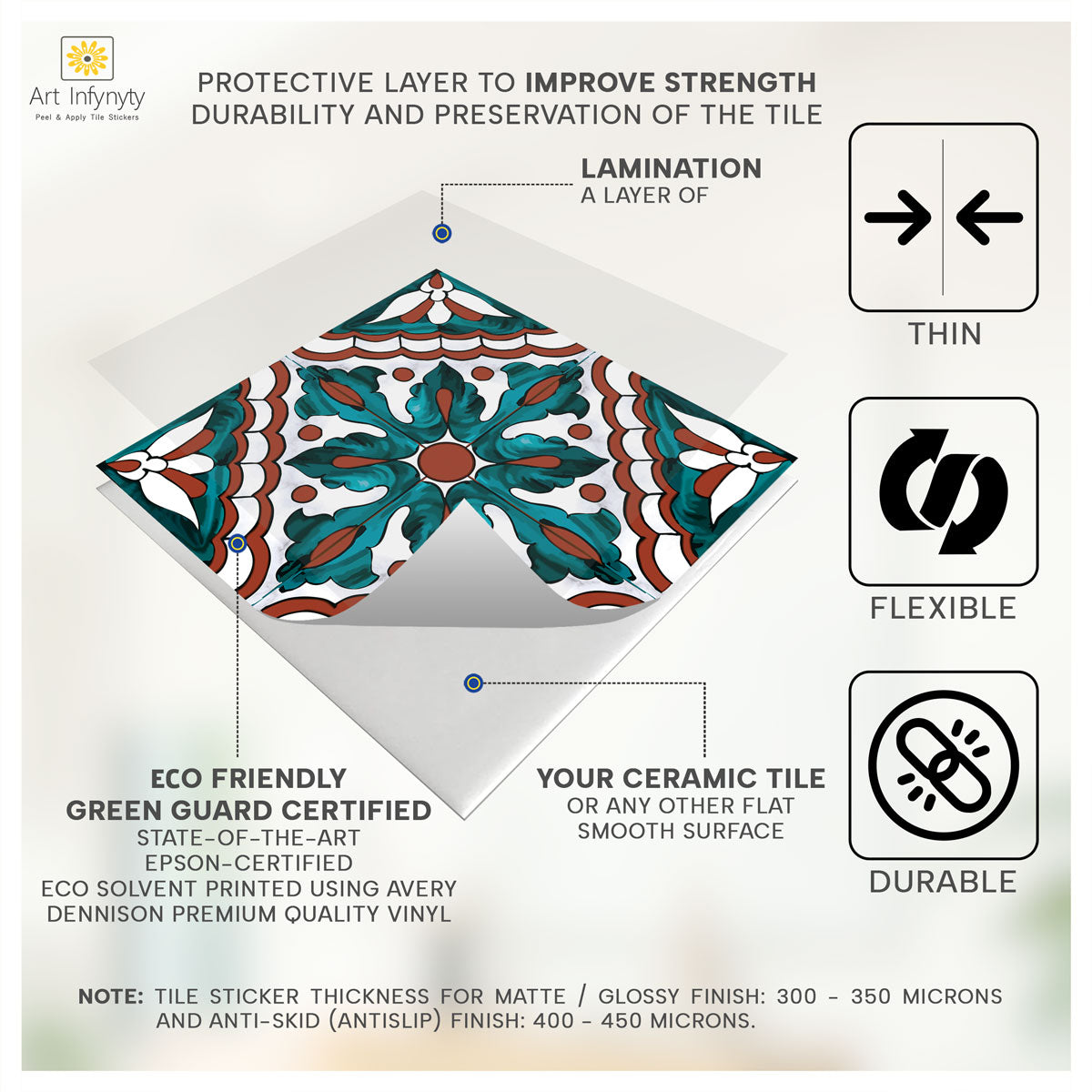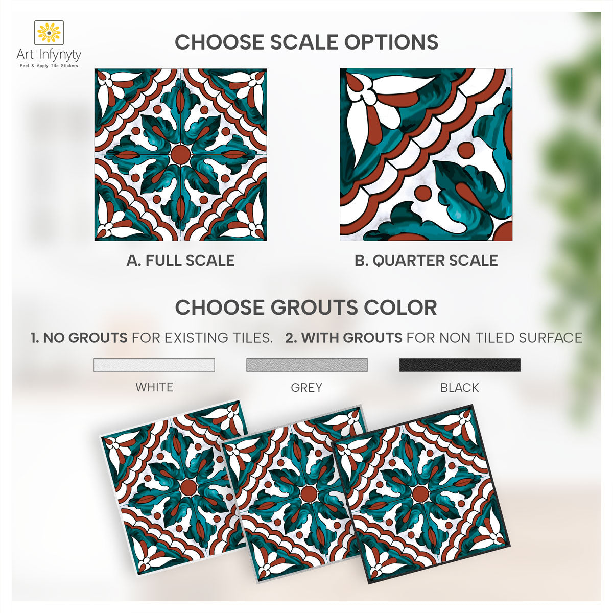 Peel and Stick Tile Moroccan Stickers | Moss Green with Terracotta Design Tile Decals | Kitchen Bathroom Wall Tile Stickers - Sample 4" x 4" - 6 Pcs / Matte Finish